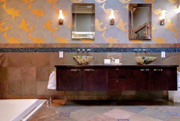 We have many modern bathroom design ideas which can help you to design luxury bathroom. Koi occupy an important place in Japanese and Chinese culture. Generally speaking, in Japan they are a symbol of love, friendship and courage, and in China - wealth and prosperity. Wallpaper with a pattern of koi gives a bright character, and interest of the bathroom in the picture below. you do not like the pattern of the fish? Choose wall coverings with Asian characters, flowering branches cherry or other iconic oriental motifs.